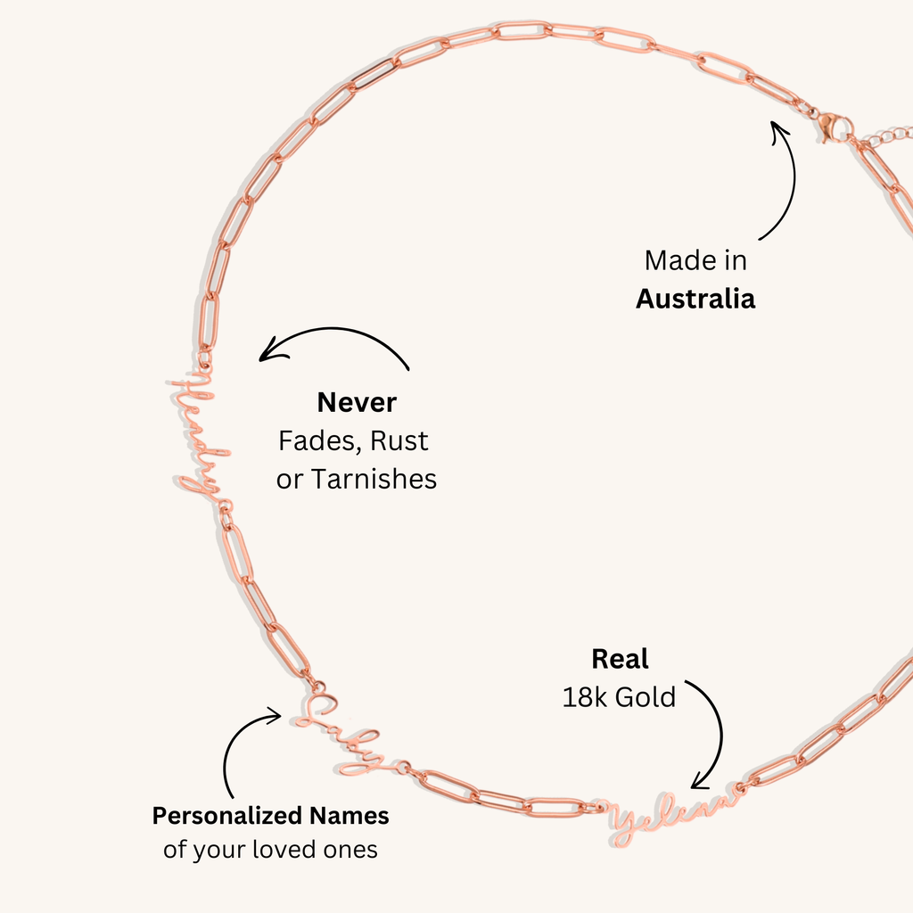 We only use the highest standard of plating. It’s extra durable, water-resistant and has an extra protective layer which means no tarnishing and no green necks. Oh, and did we mention you'll be covered under our 2 year warranty?