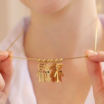 Our Family necklace with boy and girl charms is a beautifully crafted piece that symbolizes the precious bond between a family. The necklace features two separate charms, a boy and a girl, representing your loved ones. The charms are made of high-quality materials, ensuring durability and longevity.